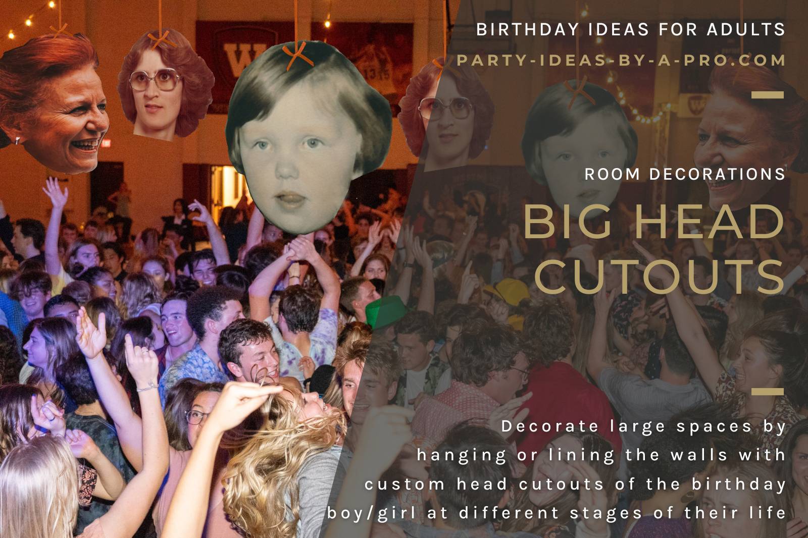 Decorate large spaces by hanging or lining the walls with custom head cutouts of the birthday boy / girl at different stages of their life